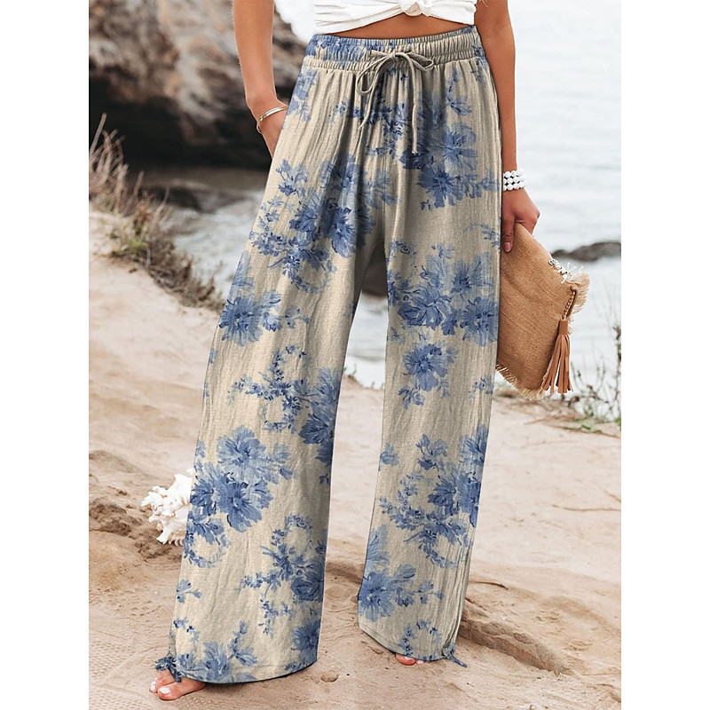 Women's Cotton Linen Wide Leg Chinos Baggy Pants Active Vacation Full Length High Waist Floral Elastic Waistband Printing Comfy Soft Comfortable Micro-elastic Outdoor Street Navy-blue Royal Blue