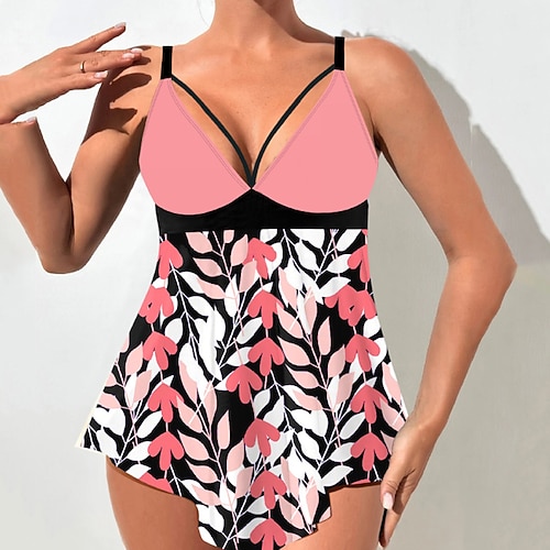 Costume da Bagno Due Pezzi da Donna Tankini Arricciato Slip Controllo Pancia Alta Vita Slim Senza Schienale Vacanza Spiaggia Fiori Grafica U Collo Senza Maniche