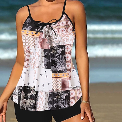 Costume da bagno 2 pezzi tankini da donna alta vita attivo vacanze a pois scollo a carellino senza maniche