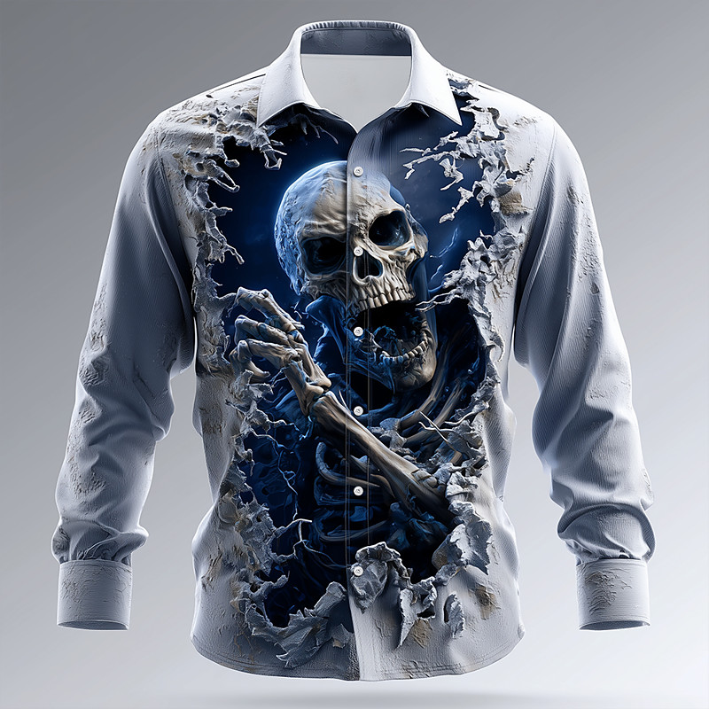 Men's Skull Horror Cracked Wall Shirt Button Up Shirt Long Sleeve Dark Gothic Style Holiday Streetwear Spring Fall Turndown 3D Print Collared Shirts Blue Dark Blue