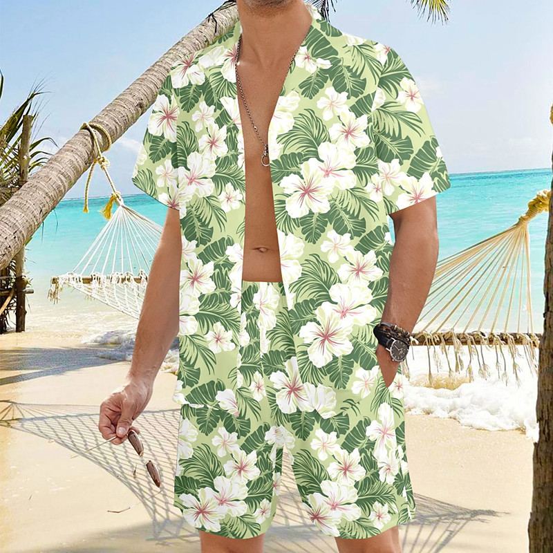 Men's Floral 2pcs Shirts Sets Summer Hawaiian Shirt Short Sleeve Short Pants Turndown Casual beach vacation Casual Daily Vacation Wear 3D Print Summer Light Pink Green