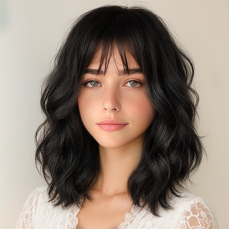 Bob Wavy Wigs for Women Reddish Caramel Brown Short Curly Hair Wig with Bangs Shoulder Length Style Synthetic Realistic Heat Resistant Wig for Everyday Hairstyle 16 Inch