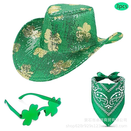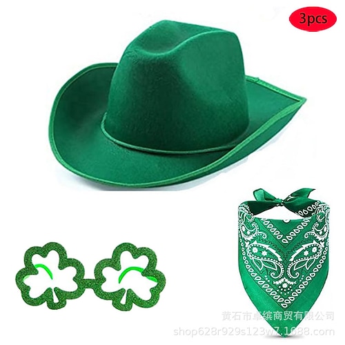 Set di 2 accessori per il giorno di San Patrizio, cappello da cowboy verde con piume, occhiali da sole a forma di cuore, bandana a forma di trifoglio, set di 3 costumi da folletto irlandese per