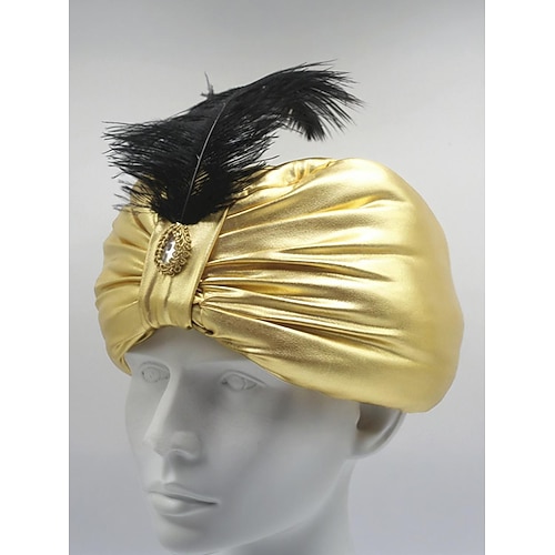 Cappello da uomo in poliestere metallizzato oro con piuma e spilla - copricapo da principe, sultano o costume arabo per carnevale e mascherata
