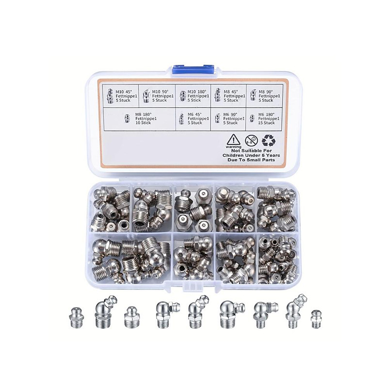 60-Piece Premium Metric Grease Nipple Zerk Fitting Kit - Complete Assortment of M6 M8 M10 Sizes with 180 45 90 Angles for Efficient Grease Gun Lubrication - Durable Metal Construction Polished