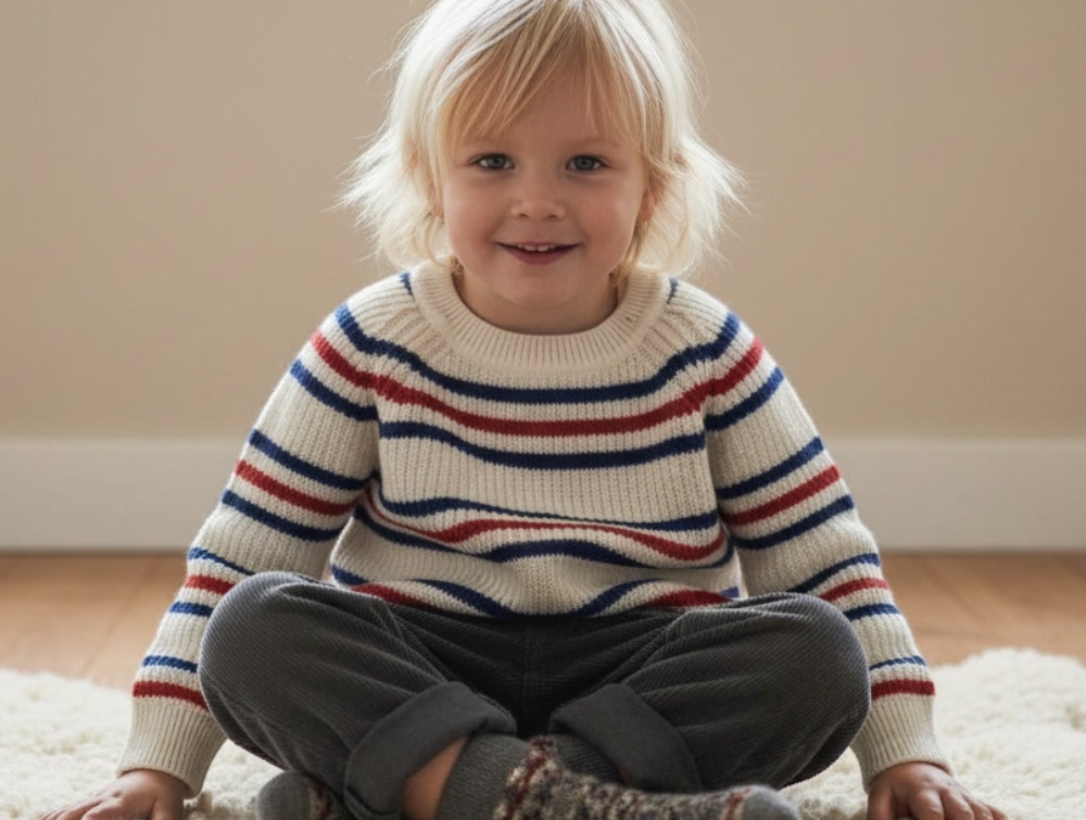 Fub Ecru/pond Blue/red Raglan Strikbluse Merinould - Str. 110 Cm
