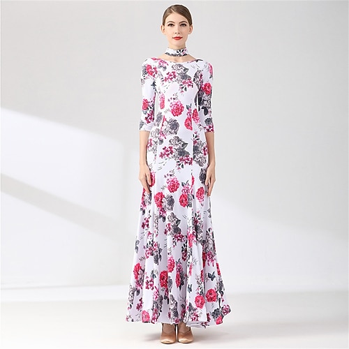 abito da ballo da sala con stampa floreale per donna - abito a trapezio con maniche a 3/4 e girocollo per gare, balli latini ed eventi di danza - nero rosa