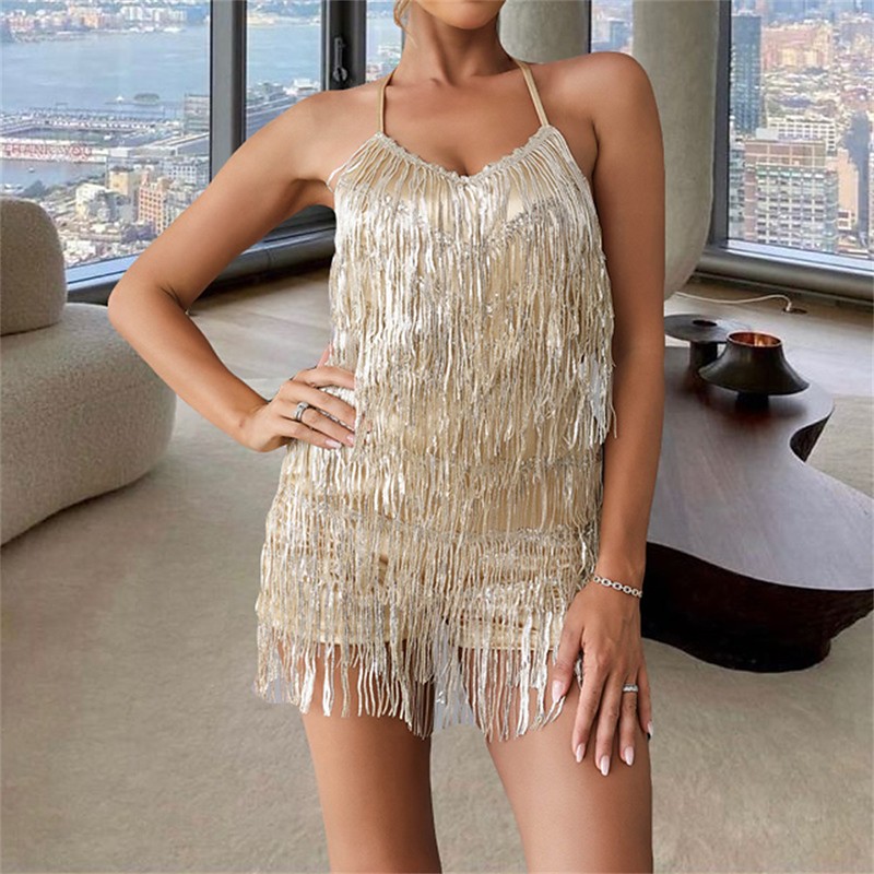 Rio Carnival Samba Dancewear Women Halter Tassel Fringe Romper Layered Fringe Mini Dress Backless Brazil Festival Performance Costume