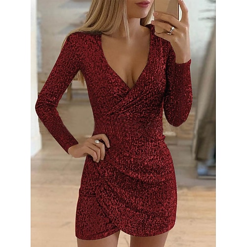 Per donna Mini Abito Tubino Casual Feste Quotidiano Taglia piccola Semplice Manica Lunga Scollo a V Argento Rosa Vino Verde Primavera Autunno
