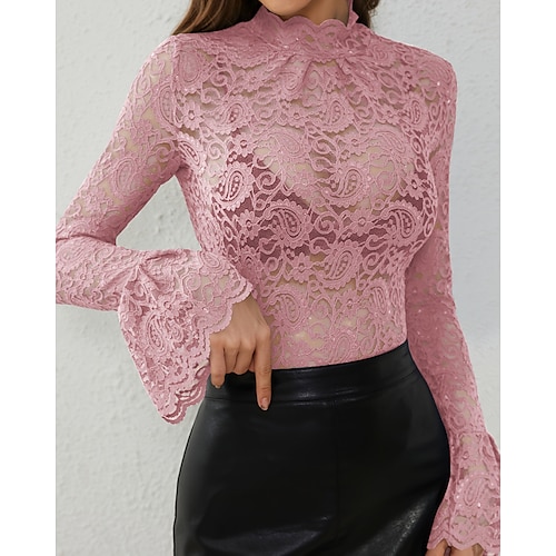 Per donna Blusa Top in chiffon Top in pizzo Semplice Elegante Sexy Manica Lunga Collo Alto Top Regolari Ferie Uscire Pizzo Blu Nero Bianco Rosa Vino Estate Primavera