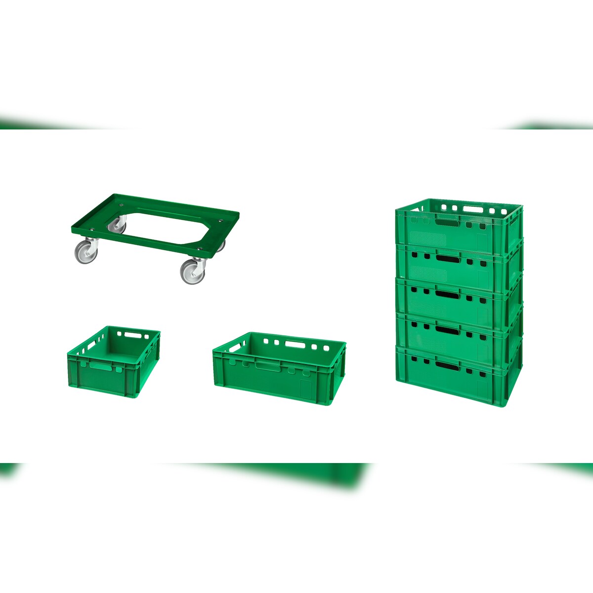 7 Stück E2-Kasten Grün + 1 grüner Transportroller mit vier Lenkrollen