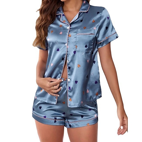 Per donna Abbigliamento da Casa Set Pigiama Moda Casual Morbido Cuore Patchwork Bottoni Shorts Casa Vacanza Manica Corta Bavero Blu Bianco Rosa Grigio Estate Primavera Autunno Vestibilità regolare