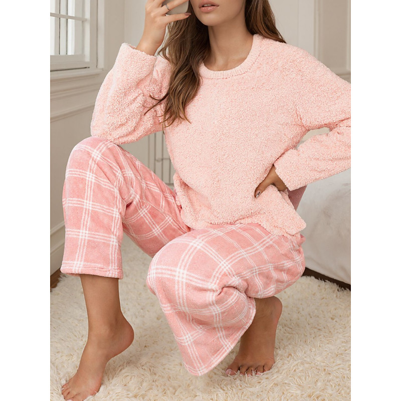Women's Loungewear Pajama Set Flannel Fashion Casual Patchwork Elastic Waist Pullover Pant Vacation Home Daily Long Sleeve Crew Neck Pink Blue Winter Tailored Fit