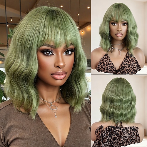 Synthetische Perücken Gewellt Lose Locken Mittelscheitel Gerader Pony Perücke 12 Zoll Rot grün Synthetische Haare 12 Zoll Damen Weich Grün