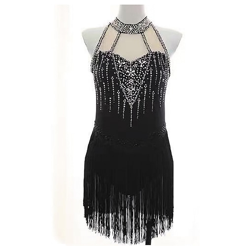 Figure Skating Dress Women's Girls' Ice Skating Dress Black Patchwork Tassel Mesh Spandex Stretchy Training Practice Professional Skating Wear Thermal Warm Crystal / Rhinestone Sleeveless Ice Skating