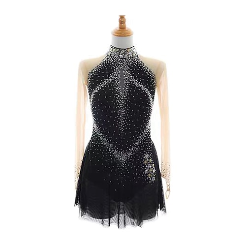 Figure Skating Dress Women's Girls' Ice Skating Dress Black Patchwork Thumbhole Mesh Spandex Stretchy Training Practice Professional Skating Wear Thermal Warm Crystal / Rhinestone Long Sleeve Ice
