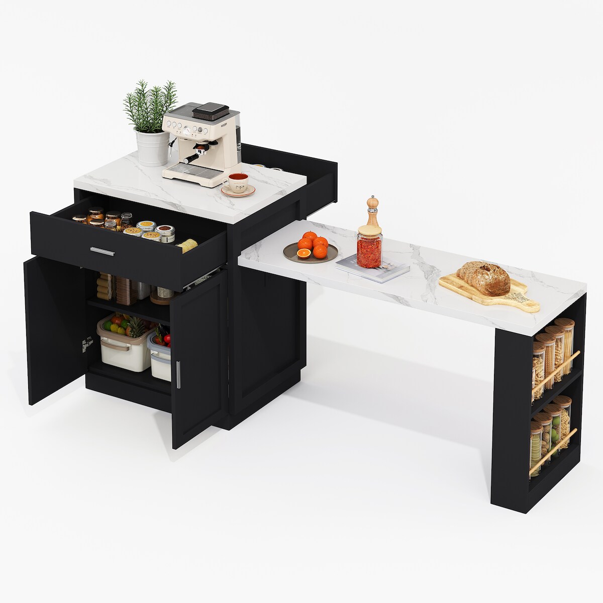 OKWISH Schwarze Kücheninsel 211x55x89 cm mit ausziehbarem Tisch 80–131 cm, USB & Steckdosen, Stauraum mit Schubladen und offenen Regalen