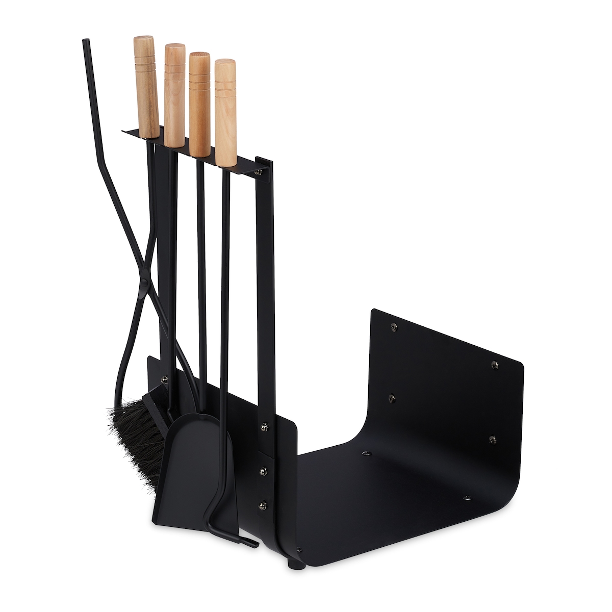 Relaxdays Kaminholzkorb Metall, mit 4 tlg. Kaminbesteck, Schaufel, Besen, Zange & Schürhaken, für innen, modern, schwarz