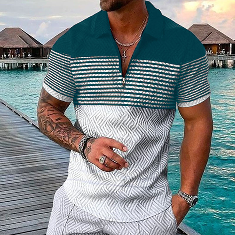 Men's Striped Hawaiian Polo Shirts Golf Shirt Short Sleeve Polo Shirts Collared Shirts Casual Beach Wear Vacation Wear Party Outfits 3D Print Quarter Zip Polo Black-White Black Army Green