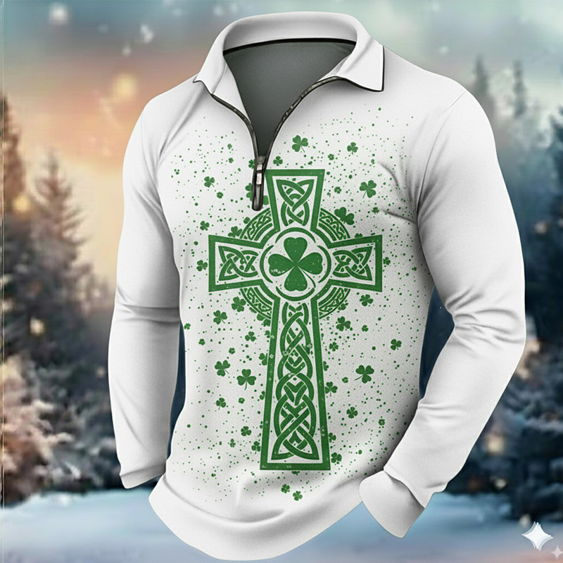 St. Patrick Men's Shamrock Polo Long Sleeve Turndown Modern Leisure Athleisure Casual Daily Festival Zipper 3D Print Spring Fall Black White Green