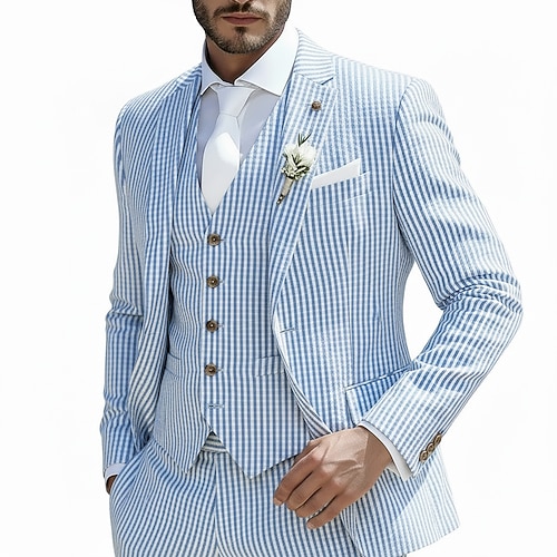 Abiti da uomo casual da spiaggia per matrimonio, sposo, in seersucker, con revers a lancia, rosa, azzurro cielo, per tutti i giorni, da festa, a righe, vestibilità su misura, 2 pezzi, monopetto, un