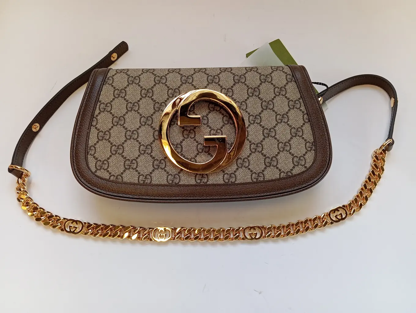 GUCCI Blondie Shoulder Bag Damen Umhängetasche Braun Leder Monogramm Goldene Akzente 28 cm