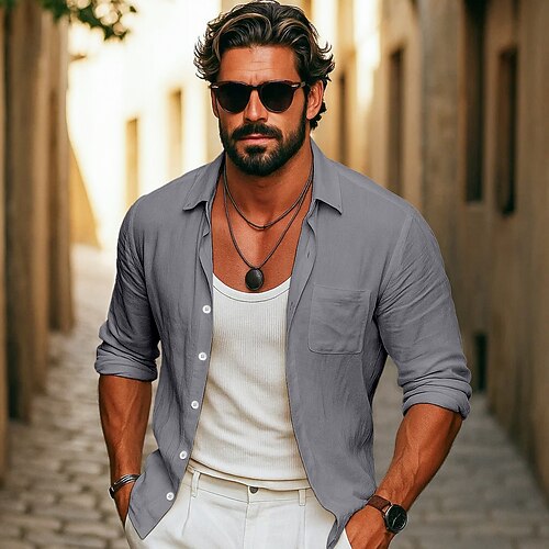 Per uomo Camicia Camicia di lino Camicia Estiva Camicia da Spiaggia Camicia con Bottoni Camicie sbottonate Tinta unica All'aperto Streetwear Nero Bianco Verde chiaro Rosa Manica Lunga Collo ripiegato