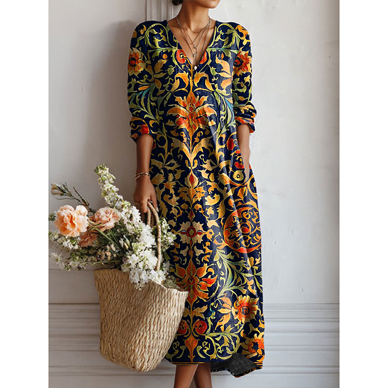 Women's Midi Dress A Line Dress Vacation Casual Daily Regular Fit Floral Graphic Long Sleeve V Neck Pink Navy Blue Blue Green Spring Fall
