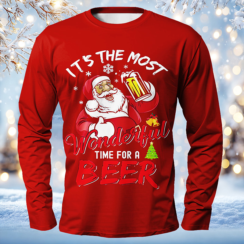 Funny Christmas Long Sleeve T Shirt for Men, Santa Beer Print, It's the Most Wonderful Time for a Beer, Holiday Party Top