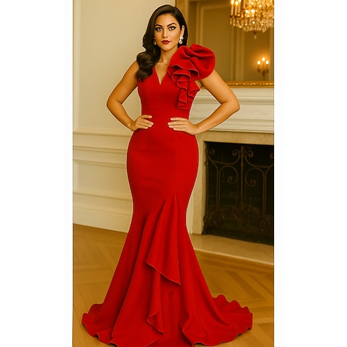 Abito da sera sirena tromba rosso e nero elegante abito formale da matrimonio lunghezza fino al pavimento smanicato collo a V crepe elastico con volant