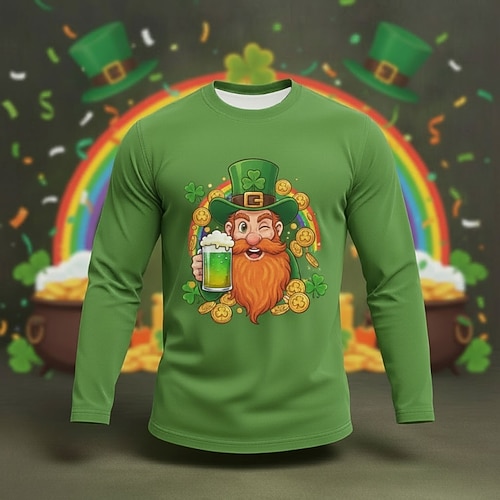T-shirt a maniche lunghe per uomo per il giorno di San Patrizio, maglietta grafica con trifoglio irlandese fortunato, scollo rotondo con stampa 3D, top per il giorno di San Patrizio