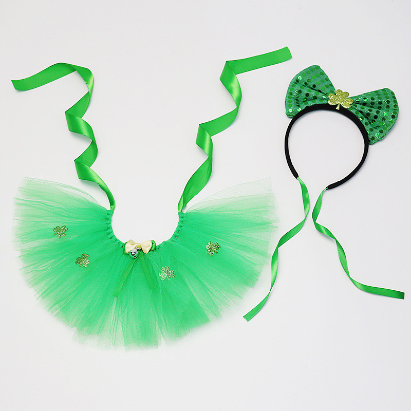 2pcs St. Patrick'S Day Dog Ballet Lace Dress Clover Headband Set with Adjustable Bow Ruffled Skirt - Green Golden Irish Holiday Outfit for Small Dogs, Pet Costume for Parades, Parties, Photo Sho