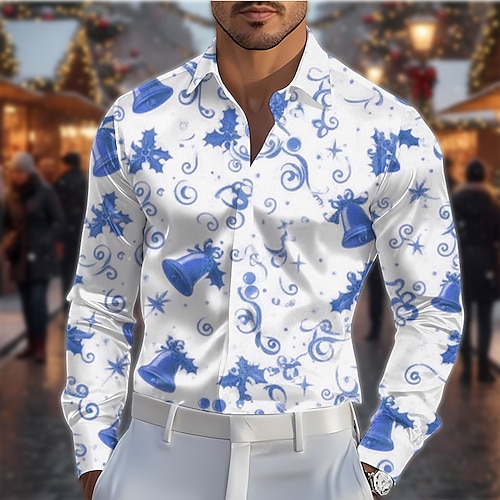 Natale Per uomo Stampa Floreale Palline di Natale Camicia Camicia in raso Camicia elegante Manica Lunga Moda Casual Feste Ferie Primavera Autunno Collo ripiegato Stampa 3D Camicie con bottoni bianco
