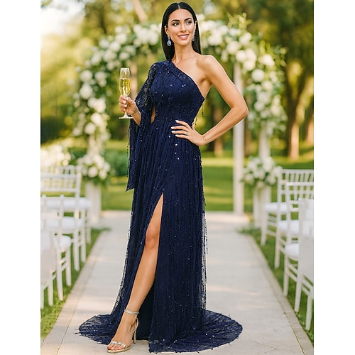 Linea ad A Lunghezza al pavimento Abito Formale Abito da sera Abiti da Quinceanera Elegante Festa Manica Lunga Monospalla Festa serale Matrimonio con Paillettes Spacco
