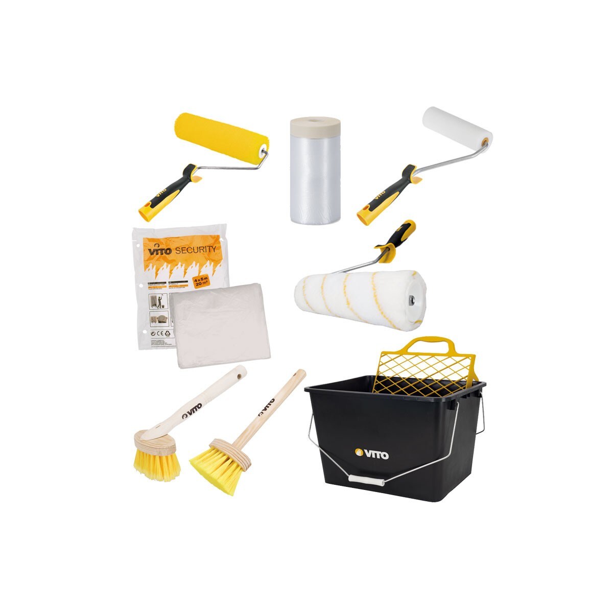 KIT 8 Malerwerkzeuge Eimer 16L. Abdeckfolie Schutzplane 2 Rollen Finishing-Roller 2 Bürsten VITO