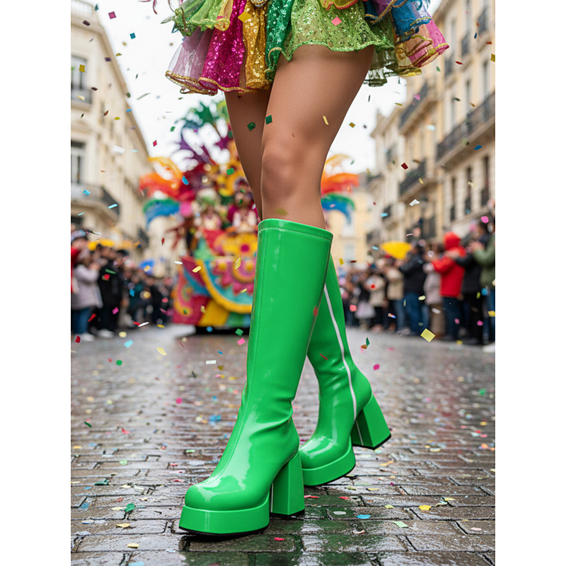 Women's 1980s Retro Metallic Gold Knee-High Platform Boots with Block Heels – Perfect for Carnival Parades and Festive Celebrations