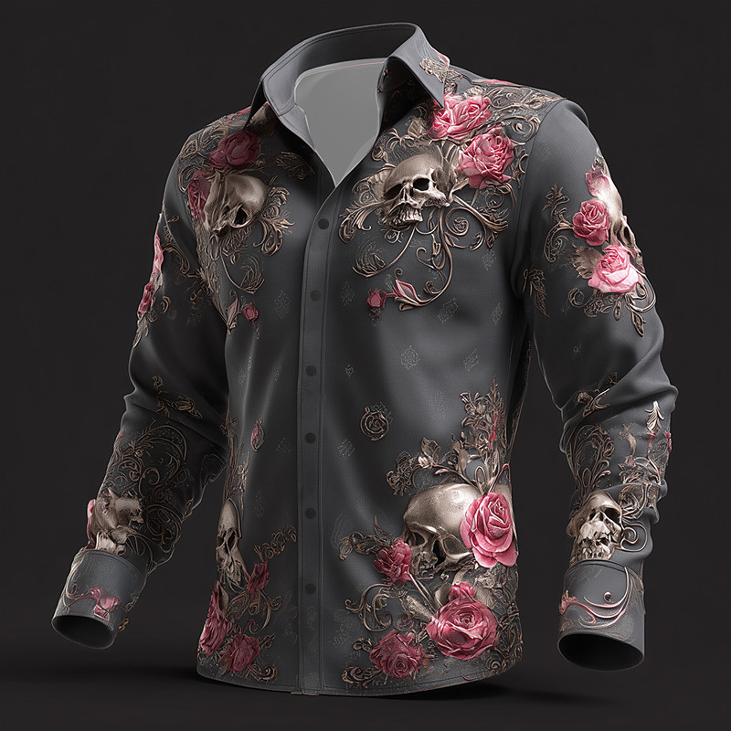 Men's Floral Print Day of the Dead Skulls Shirt Button Up Shirt Long Sleeve Dark Punk Gothic Style Outdoor Holiday Spring Fall Turndown 3D Print Linen Like Shirt Black 1 Black Black 2