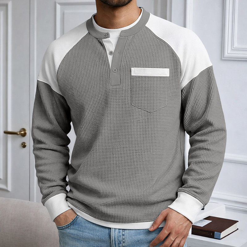 Men Waffle T-shirt T Shirt Long Sleeve Henley Fall Fall Winter All Seasons Solid Color Textured Traditional / Vintage Casual Patchwork Color Block Casual Home Outdoor Black Light Green Gray Top Tee