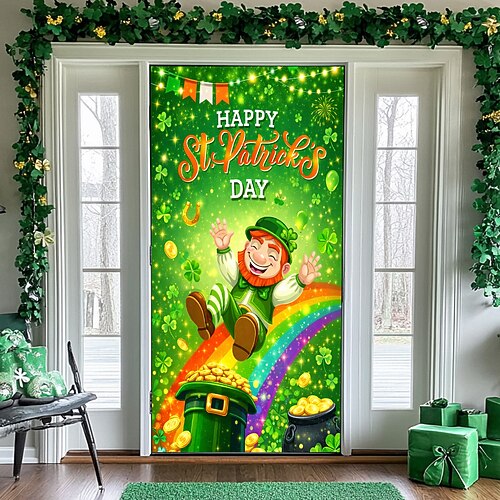 Türdekoration zum St. Patrick's Day: Fröhlicher Kobold auf Regenbogen mit Kleeblättern, festliche Eingangsdekoration für die Feierlichkeiten zum St. Patrick's Day