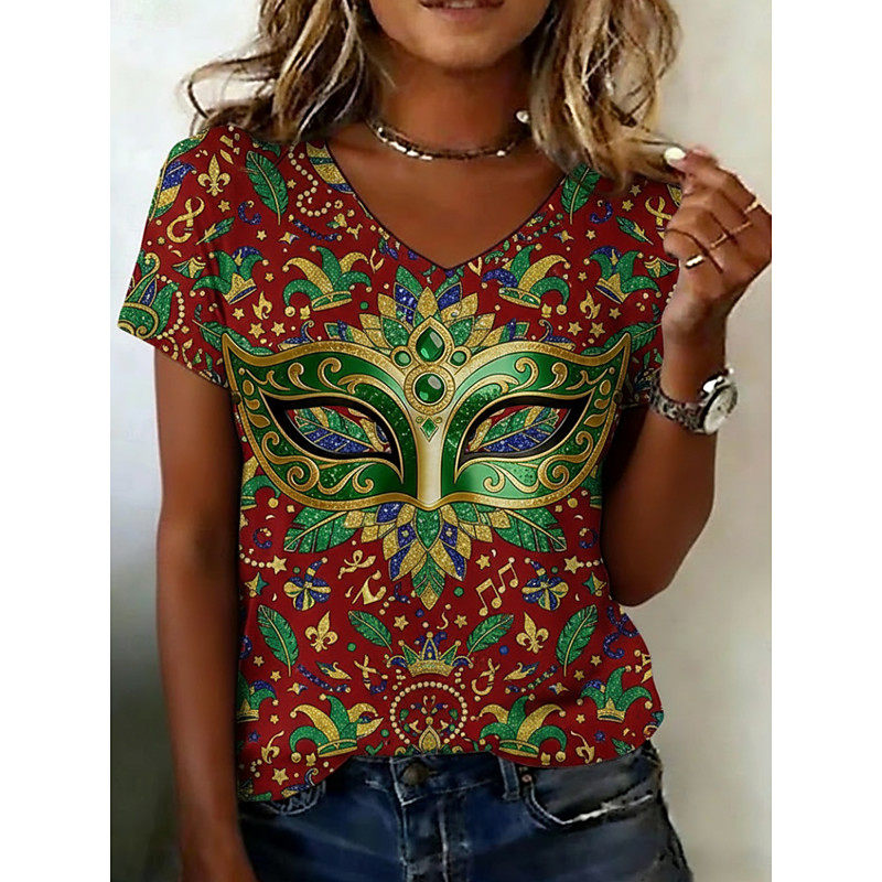 Carnival Women's T Shirt Graphic Abstract Vintage Casual Short Sleeve V Neck Regular Tops Daily Weekend Vacation Wear Print Wine Summer Spring