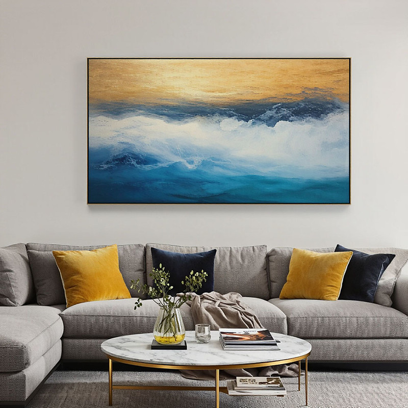 Extra Large Blue Wall Painting on Canvas Ocean Sunset Painting Gold Wall Painting Blue Abstract Art Canvas Texture Painting Beach Wall Art