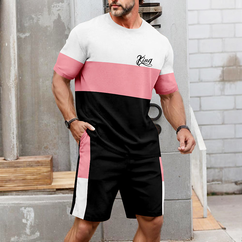 Men's Horizontal Stripes 2pcs Tees sets Summer Tops Short Sleeve Short Pants Crew Neck Sport Casual Outdoor Vacation Sport 3D Print Summer Pink Brown Green