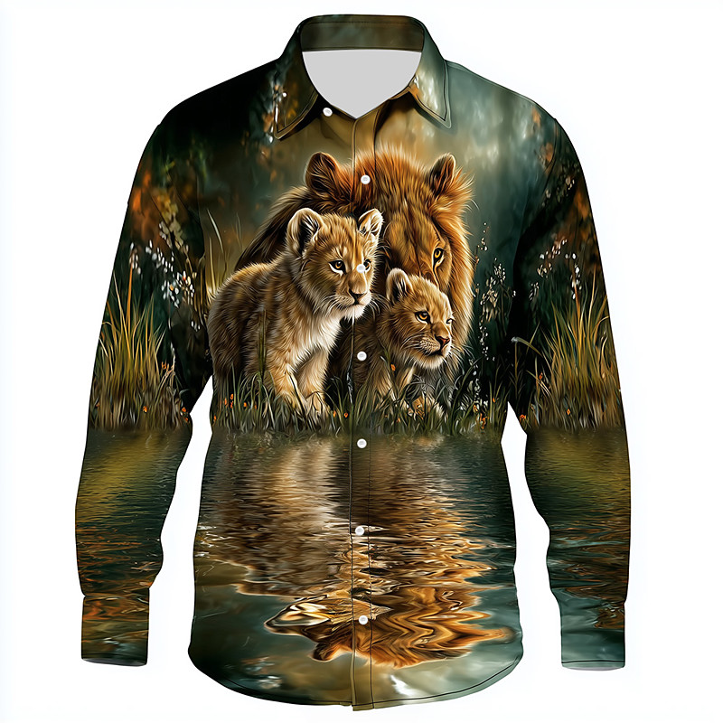 Men's Animal Lion Nature Shirt Button Up Shirt Long Sleeve Vintage Retro Outdoor Casual Holiday Spring Fall Turndown 3D Print Collared Shirts Dark Khaki Brown Green Khaki
