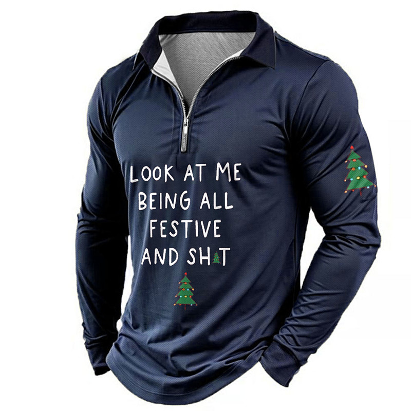 Christmas Men's Christmas Tree Zip Polo Long Sleeve Polo Shirts Collar Vacation Party Evening Wear New Years Eve Shirts 3D Print Spring Fall Winter Blue Black Red