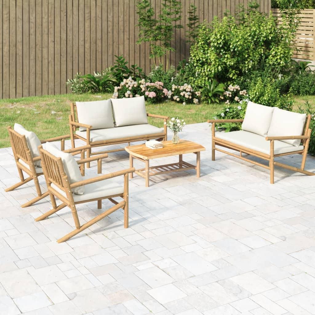 Loungesæt til haven 5 dele med cremehvide hynder bambus