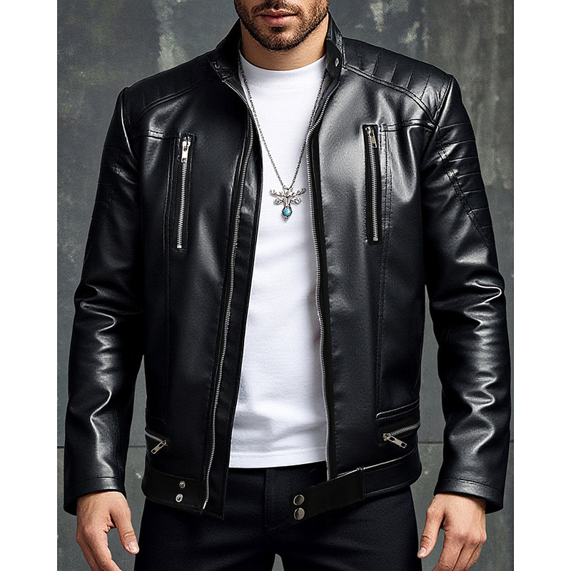 Men's Faux Leather Jacket Biker Jacket Motorcycle Jacket Vacation Daily Windproof Warm Pocket Fall Winter Plain Fashion Classic Stand Collar Regular Black Jacket