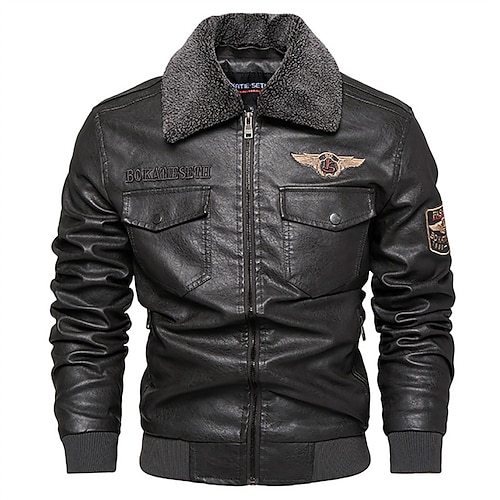 Men's Faux Leather Jacket Fleece Jacket Biker Jacket Motorcycle Jacket Vacation Daily Windproof Warm Pocket Fall Winter Plain Fashion Classic Lapel Regular Black Khaki Coffee Jacket