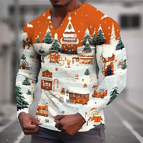 Pop art Casa Alberi Di tendenza Originale Informale Per uomo Stampa 3D Camicia Henley Maglietta Waffle Sportivo Per eventi Festival Natale maglietta Blu Rosso Arancione Manica lunga Henley Camicia