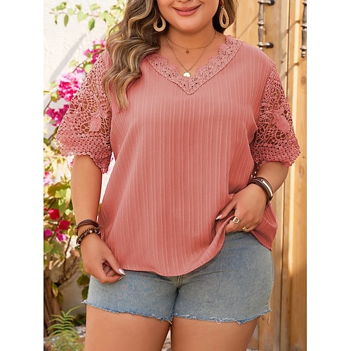 Per donna Taglia grossa Top Blusa Tinta unica Pizzo Patchwork Mezza Manica Scollo a V Moda Streetwear Quotidiano Weekend Poliestere Estate Autunno Rosa