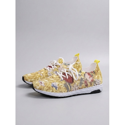 Sneakers da donna in maglia con stampa floreale gialla: scarpe casual leggere e traspiranti con suola antiscivolo ammortizzata, scarpe da passeggio alla moda per viaggi, attività all'aperto e per